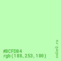 Цвет #BCFDB4 в цветовой модели RGB обозначается тремя октетами (188, 253, 180) в десятичном формате и #BCFDB4 в шестнадцатиричном (hex) формате, которые являются интенсивностью красного 188 (hex BC), интенсивность зелёного 253 (hex FD) и интенсивность синего 180 (hex B4).