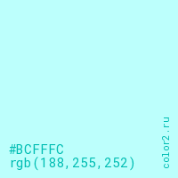 Цвет #BCFFFC в цветовой модели RGB обозначается тремя октетами (188, 255, 252) в десятичном формате и #BCFFFC в шестнадцатиричном (hex) формате, которые являются интенсивностью красного 188 (hex BC), интенсивность зелёного 255 (hex FF) и интенсивность синего 252 (hex FC).