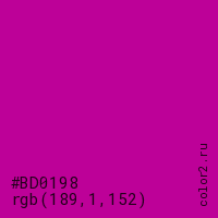 Цвет #BD0198 в цветовой модели RGB обозначается тремя октетами (189, 1, 152) в десятичном формате и #BD0198 в шестнадцатиричном (hex) формате, которые являются интенсивностью красного 189 (hex BD), интенсивность зелёного 1 (hex 01) и интенсивность синего 152 (hex 98).
