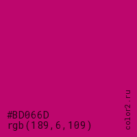 Цвет #BD066D в цветовой модели RGB обозначается тремя октетами (189, 6, 109) в десятичном формате и #BD066D в шестнадцатиричном (hex) формате, которые являются интенсивностью красного 189 (hex BD), интенсивность зелёного 6 (hex 06) и интенсивность синего 109 (hex 6D).