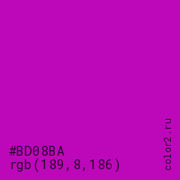 Цвет #BD08BA в цветовой модели RGB обозначается тремя октетами (189, 8, 186) в десятичном формате и #BD08BA в шестнадцатиричном (hex) формате, которые являются интенсивностью красного 189 (hex BD), интенсивность зелёного 8 (hex 08) и интенсивность синего 186 (hex BA).
