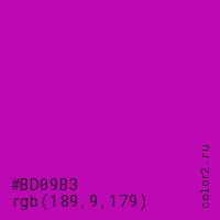 Цвет #BD09B3 в цветовой модели RGB обозначается тремя октетами (189, 9, 179) в десятичном формате и #BD09B3 в шестнадцатиричном (hex) формате, которые являются интенсивностью красного 189 (hex BD), интенсивность зелёного 9 (hex 09) и интенсивность синего 179 (hex B3).