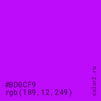Цвет #BD0CF9 в цветовой модели RGB обозначается тремя октетами (189, 12, 249) в десятичном формате и #BD0CF9 в шестнадцатиричном (hex) формате, которые являются интенсивностью красного 189 (hex BD), интенсивность зелёного 12 (hex 0C) и интенсивность синего 249 (hex F9).