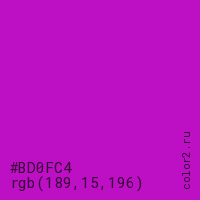 Цвет #BD0FC4 в цветовой модели RGB обозначается тремя октетами (189, 15, 196) в десятичном формате и #BD0FC4 в шестнадцатиричном (hex) формате, которые являются интенсивностью красного 189 (hex BD), интенсивность зелёного 15 (hex 0F) и интенсивность синего 196 (hex C4).