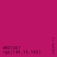 Цвет #BD1367 в цветовой модели RGB обозначается тремя октетами (189, 19, 103) в десятичном формате и #BD1367 в шестнадцатиричном (hex) формате, которые являются интенсивностью красного 189 (hex BD), интенсивность зелёного 19 (hex 13) и интенсивность синего 103 (hex 67).