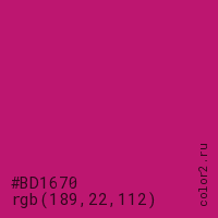 Цвет #BD1670 в цветовой модели RGB обозначается тремя октетами (189, 22, 112) в десятичном формате и #BD1670 в шестнадцатиричном (hex) формате, которые являются интенсивностью красного 189 (hex BD), интенсивность зелёного 22 (hex 16) и интенсивность синего 112 (hex 70).