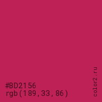 Цвет #BD2156 в цветовой модели RGB обозначается тремя октетами (189, 33, 86) в десятичном формате и #BD2156 в шестнадцатиричном (hex) формате, которые являются интенсивностью красного 189 (hex BD), интенсивность зелёного 33 (hex 21) и интенсивность синего 86 (hex 56).