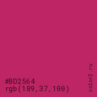 Цвет #BD2564 в цветовой модели RGB обозначается тремя октетами (189, 37, 100) в десятичном формате и #BD2564 в шестнадцатиричном (hex) формате, которые являются интенсивностью красного 189 (hex BD), интенсивность зелёного 37 (hex 25) и интенсивность синего 100 (hex 64).