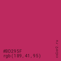 Цвет #BD295F в цветовой модели RGB обозначается тремя октетами (189, 41, 95) в десятичном формате и #BD295F в шестнадцатиричном (hex) формате, которые являются интенсивностью красного 189 (hex BD), интенсивность зелёного 41 (hex 29) и интенсивность синего 95 (hex 5F).