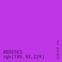 Цвет #BD35E5 в цветовой модели RGB обозначается тремя октетами (189, 53, 229) в десятичном формате и #BD35E5 в шестнадцатиричном (hex) формате, которые являются интенсивностью красного 189 (hex BD), интенсивность зелёного 53 (hex 35) и интенсивность синего 229 (hex E5).
