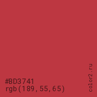 Цвет #BD3741 в цветовой модели RGB обозначается тремя октетами (189, 55, 65) в десятичном формате и #BD3741 в шестнадцатиричном (hex) формате, которые являются интенсивностью красного 189 (hex BD), интенсивность зелёного 55 (hex 37) и интенсивность синего 65 (hex 41).