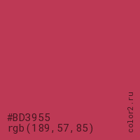 Цвет #BD3955 в цветовой модели RGB обозначается тремя октетами (189, 57, 85) в десятичном формате и #BD3955 в шестнадцатиричном (hex) формате, которые являются интенсивностью красного 189 (hex BD), интенсивность зелёного 57 (hex 39) и интенсивность синего 85 (hex 55).