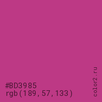 Цвет #BD3985 в цветовой модели RGB обозначается тремя октетами (189, 57, 133) в десятичном формате и #BD3985 в шестнадцатиричном (hex) формате, которые являются интенсивностью красного 189 (hex BD), интенсивность зелёного 57 (hex 39) и интенсивность синего 133 (hex 85).