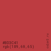 Цвет #BD3C41 в цветовой модели RGB обозначается тремя октетами (189, 60, 65) в десятичном формате и #BD3C41 в шестнадцатиричном (hex) формате, которые являются интенсивностью красного 189 (hex BD), интенсивность зелёного 60 (hex 3C) и интенсивность синего 65 (hex 41).