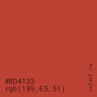 Цвет #BD4133 в цветовой модели RGB обозначается тремя октетами (189, 65, 51) в десятичном формате и #BD4133 в шестнадцатиричном (hex) формате, которые являются интенсивностью красного 189 (hex BD), интенсивность зелёного 65 (hex 41) и интенсивность синего 51 (hex 33).