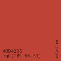 Цвет #BD4235 в цветовой модели RGB обозначается тремя октетами (189, 66, 53) в десятичном формате и #BD4235 в шестнадцатиричном (hex) формате, которые являются интенсивностью красного 189 (hex BD), интенсивность зелёного 66 (hex 42) и интенсивность синего 53 (hex 35).