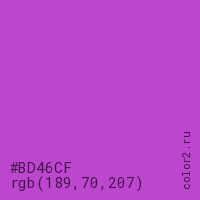 Цвет #BD46CF в цветовой модели RGB обозначается тремя октетами (189, 70, 207) в десятичном формате и #BD46CF в шестнадцатиричном (hex) формате, которые являются интенсивностью красного 189 (hex BD), интенсивность зелёного 70 (hex 46) и интенсивность синего 207 (hex CF).