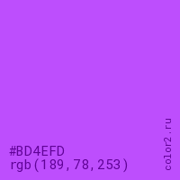 Цвет RGB(189, 78, 253) в процентом отношении количества цвета состоит из 74.1% красного (red), 30.6% зелёного (green) и 99.2% синего (blue).