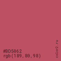 Цвет #BD5062 в цветовой модели RGB обозначается тремя октетами (189, 80, 98) в десятичном формате и #BD5062 в шестнадцатиричном (hex) формате, которые являются интенсивностью красного 189 (hex BD), интенсивность зелёного 80 (hex 50) и интенсивность синего 98 (hex 62).
