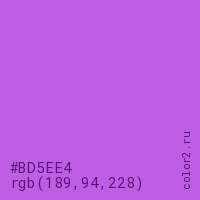 Цвет #BD5EE4 в цветовой модели RGB обозначается тремя октетами (189, 94, 228) в десятичном формате и #BD5EE4 в шестнадцатиричном (hex) формате, которые являются интенсивностью красного 189 (hex BD), интенсивность зелёного 94 (hex 5E) и интенсивность синего 228 (hex E4).
