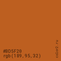 Цвет #BD5F20 в цветовой модели RGB обозначается тремя октетами (189, 95, 32) в десятичном формате и #BD5F20 в шестнадцатиричном (hex) формате, которые являются интенсивностью красного 189 (hex BD), интенсивность зелёного 95 (hex 5F) и интенсивность синего 32 (hex 20).