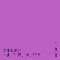 Цвет #BD60C4 в цветовой модели RGB обозначается тремя октетами (189, 96, 196) в десятичном формате и #BD60C4 в шестнадцатиричном (hex) формате, которые являются интенсивностью красного 189 (hex BD), интенсивность зелёного 96 (hex 60) и интенсивность синего 196 (hex C4).