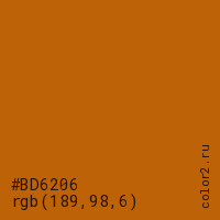 Цвет #BD6206 в цветовой модели RGB обозначается тремя октетами (189, 98, 6) в десятичном формате и #BD6206 в шестнадцатиричном (hex) формате, которые являются интенсивностью красного 189 (hex BD), интенсивность зелёного 98 (hex 62) и интенсивность синего 6 (hex 06).