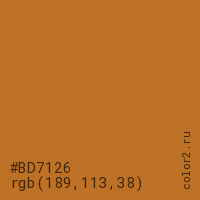 Цвет #BD7126 в цветовой модели RGB обозначается тремя октетами (189, 113, 38) в десятичном формате и #BD7126 в шестнадцатиричном (hex) формате, которые являются интенсивностью красного 189 (hex BD), интенсивность зелёного 113 (hex 71) и интенсивность синего 38 (hex 26).