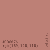 Цвет #BD8076 в цветовой модели RGB обозначается тремя октетами (189, 128, 118) в десятичном формате и #BD8076 в шестнадцатиричном (hex) формате, которые являются интенсивностью красного 189 (hex BD), интенсивность зелёного 128 (hex 80) и интенсивность синего 118 (hex 76).