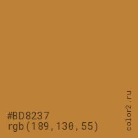 Цвет #BD8237 в цветовой модели RGB обозначается тремя октетами (189, 130, 55) в десятичном формате и #BD8237 в шестнадцатиричном (hex) формате, которые являются интенсивностью красного 189 (hex BD), интенсивность зелёного 130 (hex 82) и интенсивность синего 55 (hex 37).