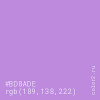 Цвет #BD8ADE в цветовой модели RGB обозначается тремя октетами (189, 138, 222) в десятичном формате и #BD8ADE в шестнадцатиричном (hex) формате, которые являются интенсивностью красного 189 (hex BD), интенсивность зелёного 138 (hex 8A) и интенсивность синего 222 (hex DE).