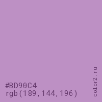 Цвет #BD90C4 в цветовой модели RGB обозначается тремя октетами (189, 144, 196) в десятичном формате и #BD90C4 в шестнадцатиричном (hex) формате, которые являются интенсивностью красного 189 (hex BD), интенсивность зелёного 144 (hex 90) и интенсивность синего 196 (hex C4).
