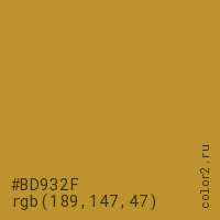 Цвет #BD932F в цветовой модели RGB обозначается тремя октетами (189, 147, 47) в десятичном формате и #BD932F в шестнадцатиричном (hex) формате, которые являются интенсивностью красного 189 (hex BD), интенсивность зелёного 147 (hex 93) и интенсивность синего 47 (hex 2F).