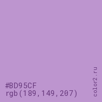 Цвет #BD95CF в цветовой модели RGB обозначается тремя октетами (189, 149, 207) в десятичном формате и #BD95CF в шестнадцатиричном (hex) формате, которые являются интенсивностью красного 189 (hex BD), интенсивность зелёного 149 (hex 95) и интенсивность синего 207 (hex CF).
