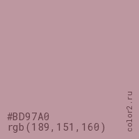 Цвет #BD97A0 в цветовой модели RGB обозначается тремя октетами (189, 151, 160) в десятичном формате и #BD97A0 в шестнадцатиричном (hex) формате, которые являются интенсивностью красного 189 (hex BD), интенсивность зелёного 151 (hex 97) и интенсивность синего 160 (hex A0).