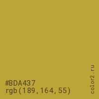 Цвет #BDA437 в цветовой модели RGB обозначается тремя октетами (189, 164, 55) в десятичном формате и #BDA437 в шестнадцатиричном (hex) формате, которые являются интенсивностью красного 189 (hex BD), интенсивность зелёного 164 (hex A4) и интенсивность синего 55 (hex 37).