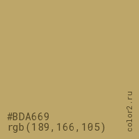 Цвет #BDA669 в цветовой модели RGB обозначается тремя октетами (189, 166, 105) в десятичном формате и #BDA669 в шестнадцатиричном (hex) формате, которые являются интенсивностью красного 189 (hex BD), интенсивность зелёного 166 (hex A6) и интенсивность синего 105 (hex 69).