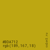 Цвет #BDA712 в цветовой модели RGB обозначается тремя октетами (189, 167, 18) в десятичном формате и #BDA712 в шестнадцатиричном (hex) формате, которые являются интенсивностью красного 189 (hex BD), интенсивность зелёного 167 (hex A7) и интенсивность синего 18 (hex 12).