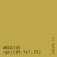 Цвет #BDA749 в цветовой модели RGB обозначается тремя октетами (189, 167, 73) в десятичном формате и #BDA749 в шестнадцатиричном (hex) формате, которые являются интенсивностью красного 189 (hex BD), интенсивность зелёного 167 (hex A7) и интенсивность синего 73 (hex 49).