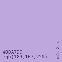 Цвет #BDA7DC в цветовой модели RGB обозначается тремя октетами (189, 167, 220) в десятичном формате и #BDA7DC в шестнадцатиричном (hex) формате, которые являются интенсивностью красного 189 (hex BD), интенсивность зелёного 167 (hex A7) и интенсивность синего 220 (hex DC).