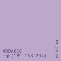 Цвет #BDA8CC в цветовой модели RGB обозначается тремя октетами (189, 168, 204) в десятичном формате и #BDA8CC в шестнадцатиричном (hex) формате, которые являются интенсивностью красного 189 (hex BD), интенсивность зелёного 168 (hex A8) и интенсивность синего 204 (hex CC).