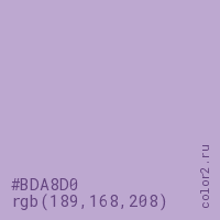 Цвет #BDA8D0 в цветовой модели RGB обозначается тремя октетами (189, 168, 208) в десятичном формате и #BDA8D0 в шестнадцатиричном (hex) формате, которые являются интенсивностью красного 189 (hex BD), интенсивность зелёного 168 (hex A8) и интенсивность синего 208 (hex D0).