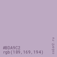 Цвет #BDA9C2 в цветовой модели RGB обозначается тремя октетами (189, 169, 194) в десятичном формате и #BDA9C2 в шестнадцатиричном (hex) формате, которые являются интенсивностью красного 189 (hex BD), интенсивность зелёного 169 (hex A9) и интенсивность синего 194 (hex C2).