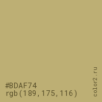 Цвет #BDAF74 в цветовой модели RGB обозначается тремя октетами (189, 175, 116) в десятичном формате и #BDAF74 в шестнадцатиричном (hex) формате, которые являются интенсивностью красного 189 (hex BD), интенсивность зелёного 175 (hex AF) и интенсивность синего 116 (hex 74).