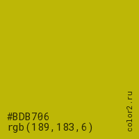 Цвет #BDB706 в цветовой модели RGB обозначается тремя октетами (189, 183, 6) в десятичном формате и #BDB706 в шестнадцатиричном (hex) формате, которые являются интенсивностью красного 189 (hex BD), интенсивность зелёного 183 (hex B7) и интенсивность синего 6 (hex 06).