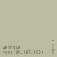 Цвет #BDBBA0 в цветовой модели RGB обозначается тремя октетами (189, 187, 160) в десятичном формате и #BDBBA0 в шестнадцатиричном (hex) формате, которые являются интенсивностью красного 189 (hex BD), интенсивность зелёного 187 (hex BB) и интенсивность синего 160 (hex A0).