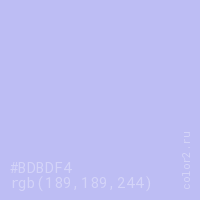 Цвет #BDBDF4 в цветовой модели RGB обозначается тремя октетами (189, 189, 244) в десятичном формате и #BDBDF4 в шестнадцатиричном (hex) формате, которые являются интенсивностью красного 189 (hex BD), интенсивность зелёного 189 (hex BD) и интенсивность синего 244 (hex F4).