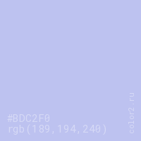 Цвет #BDC2F0 в цветовой модели RGB обозначается тремя октетами (189, 194, 240) в десятичном формате и #BDC2F0 в шестнадцатиричном (hex) формате, которые являются интенсивностью красного 189 (hex BD), интенсивность зелёного 194 (hex C2) и интенсивность синего 240 (hex F0).