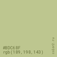Цвет #BDC68F в цветовой модели RGB обозначается тремя октетами (189, 198, 143) в десятичном формате и #BDC68F в шестнадцатиричном (hex) формате, которые являются интенсивностью красного 189 (hex BD), интенсивность зелёного 198 (hex C6) и интенсивность синего 143 (hex 8F).