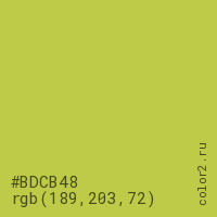 Цвет #BDCB48 в цветовой модели RGB обозначается тремя октетами (189, 203, 72) в десятичном формате и #BDCB48 в шестнадцатиричном (hex) формате, которые являются интенсивностью красного 189 (hex BD), интенсивность зелёного 203 (hex CB) и интенсивность синего 72 (hex 48).